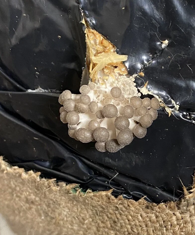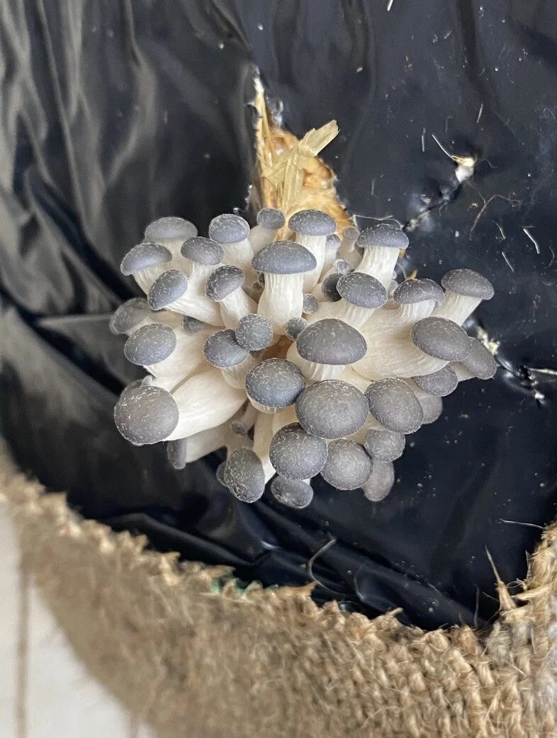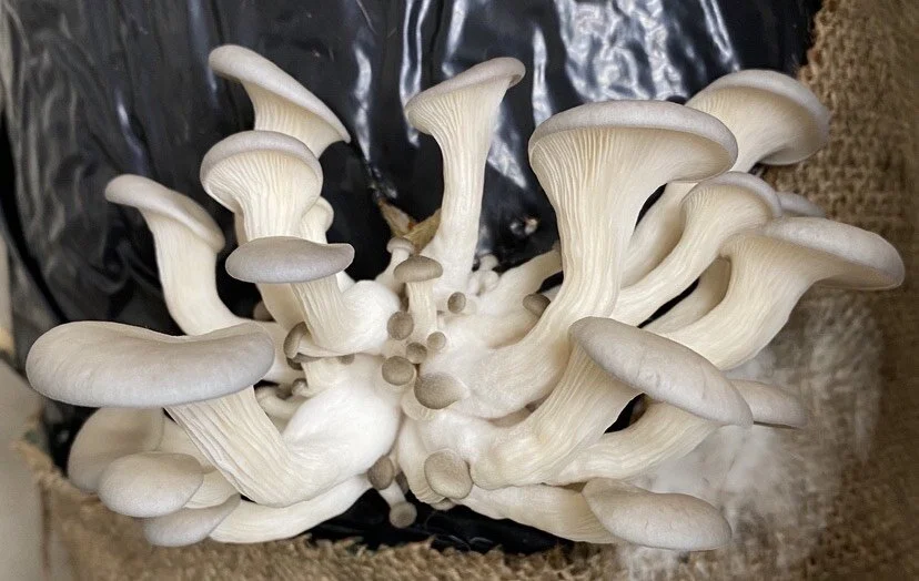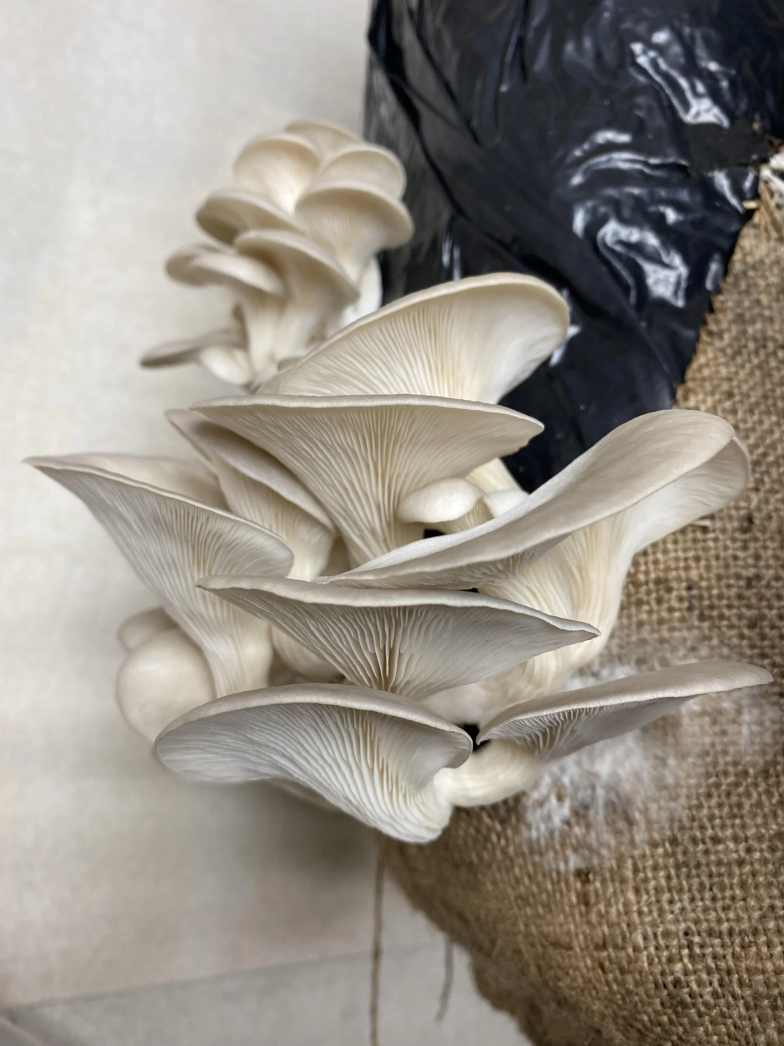The Grey Dove/Blue Oyster mushrooms are fruiting! See their growing progress below.
